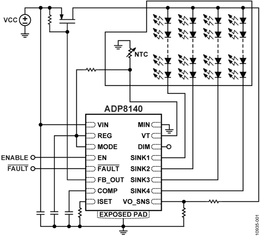 ADP8140可提供最多4个LED驱动器的高电流控制能力。每个驱动器的最大吸电流能力为500 mA。采用一个外部电阻可针对全部4个驱动器对吸电流进行设置。该器件具有反馈输出特性,可控制外部电源以优化效率。ADP8140还能保护LED、电源和该器件本身,避免发生热事件、短路、过压和LED开路。多个ADP8140 IC可轻松并联,以驱动额外的LED串,或更高电流的LED。ADP8140采用小型散热增强LFCSP(引脚架构芯片级封装)。