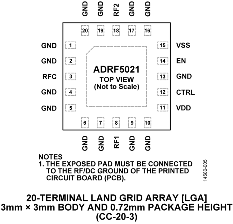ADRF5021是一款通用型单刀双掷(SPDT)开关,采用硅工艺制造。它采用3 mm × 3 mm、20引脚基板栅格阵列(LGA)封装,在9 kHz至30 GHz频率范围内提供高隔离度和低插入损耗。
