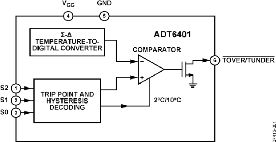 引脚可选阈值设置增量为10°C,设置范围为−45°C至+115°C。