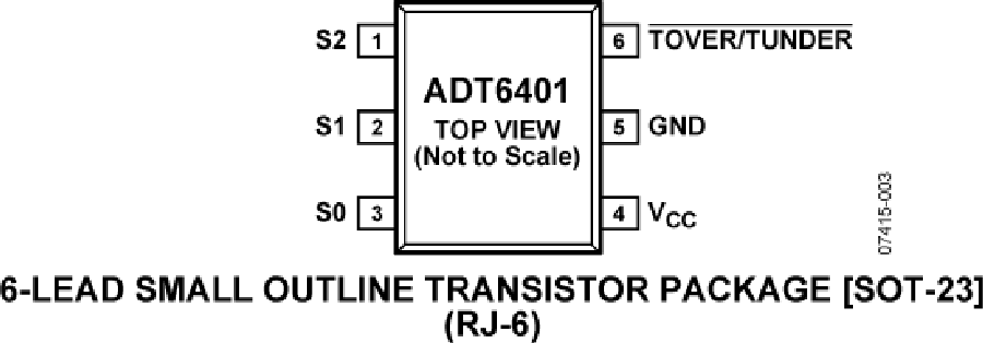 ADT6401/ADT6402为跳变点温度开关,提供6引脚SOT-23封装。 它们都含有一个内置带隙温度传感器,用于局部温度检测。 当温度超过跳变点设置时,逻辑输出被激活。 ADT6401逻辑输出为低电平有效和开漏输出。 ADT6402逻辑输出为高电平有效和推挽输出。 经数字化转换后,温度的分辨率为0.125°C(11位)。 引脚可选跳变点设置间距为10°C,欠温开关设置范围为−45°C至+5°C,过温开关设置范围为45°C至115°C。