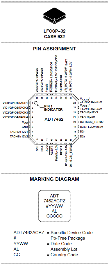The ADT7462 is a flexible systems monitor IC, suitable for use in a wide variety of applications.It can monitor temperature in up to three remote locations, as well as its ambient temperature. There are up to four PWM outputs. These can be used to control the speed of a cooling fan by varying the % duty cycle of the PWM drive signal applied to the fan. The ADT7462 supports high frequency PWM for 4-wire fans and low frequency PWM for 2-wire and 3-wire fans. Up to eight TACH inputs can be used to measure the speed of 3-wire and 4-wire fans. There are up to 13 voltage monitoring inputs, ranging from 12 V to 0.9 V.