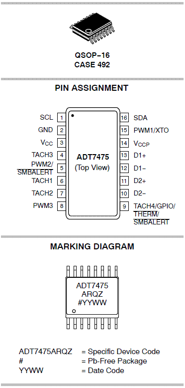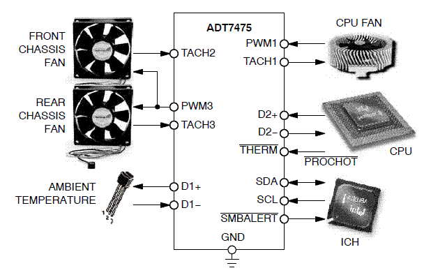 The ADT7475 controller is a thermal monitor and multiple PWM fan controller for noise-sensitive or power-sensitive applications requiring active system cooling. The ADT7475 can drive a fan using either a low or high frequency drive signal, monitor the temperature of up to two remote sensor diodes plus its own internal temperature, and measure and control the speed of up to four fans so that they operate at the lowest possible speed for minimum acoustic noise.
