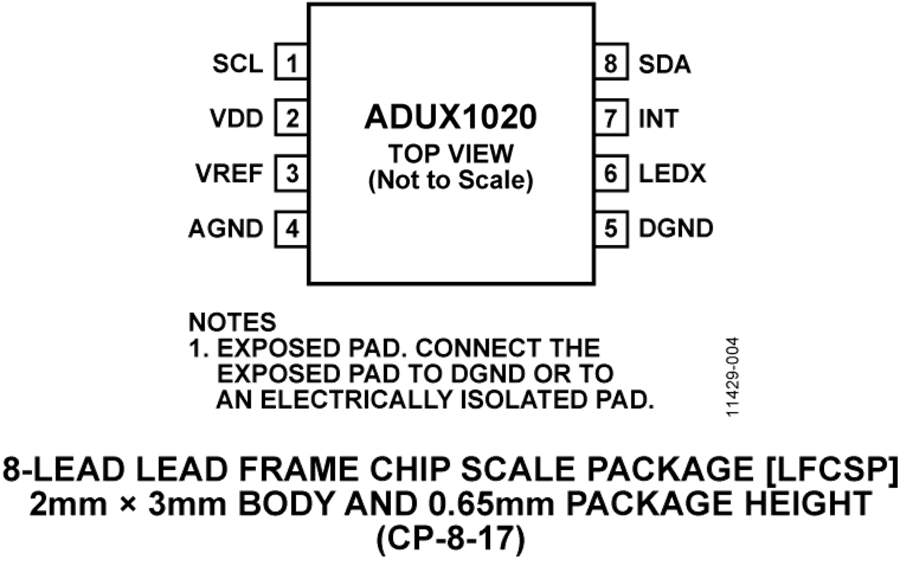 ADUX1020采用小型2 mm × 3 mm、8引脚LFCSP透明封装,额定工作温度范围为-40°C至+85°C。