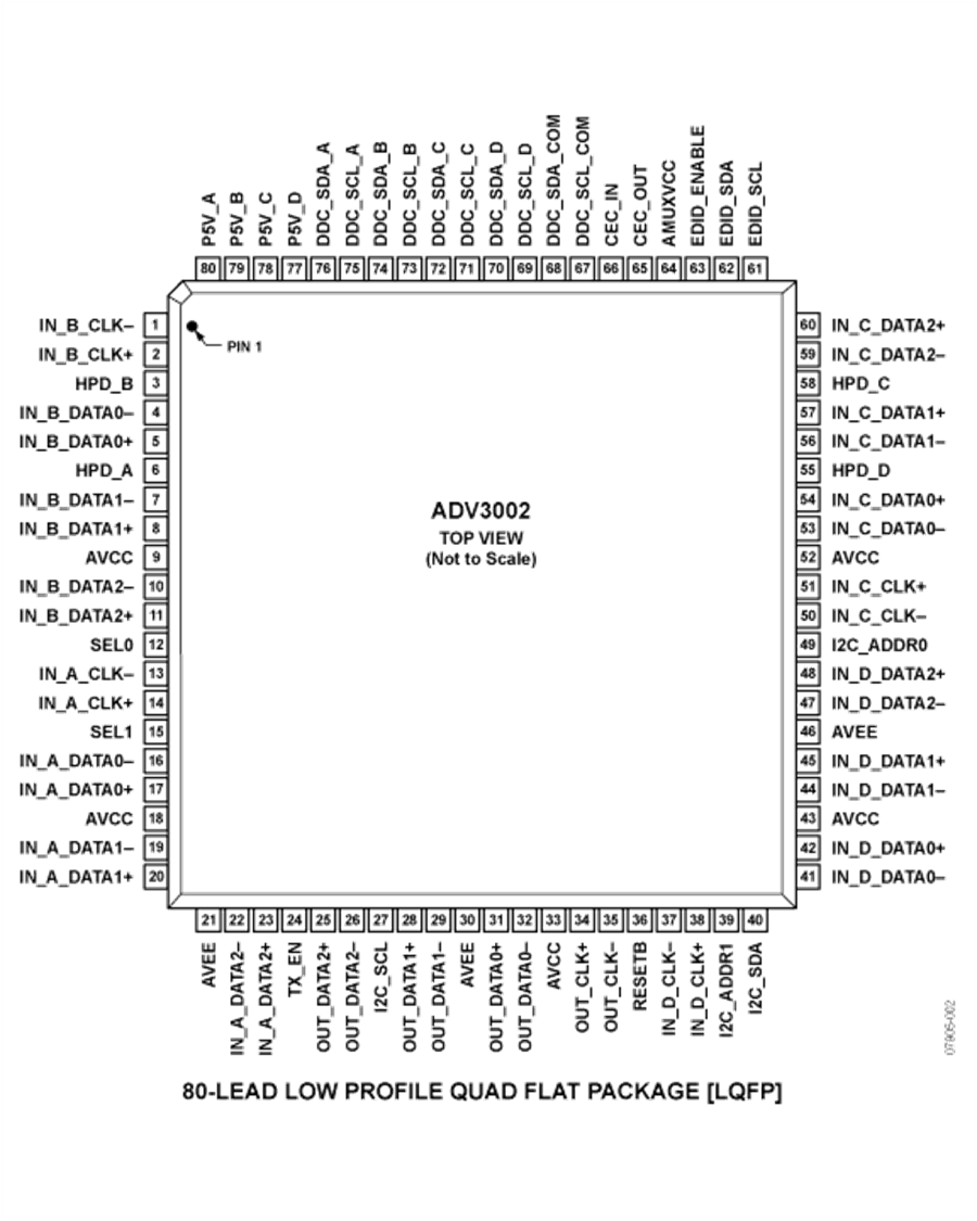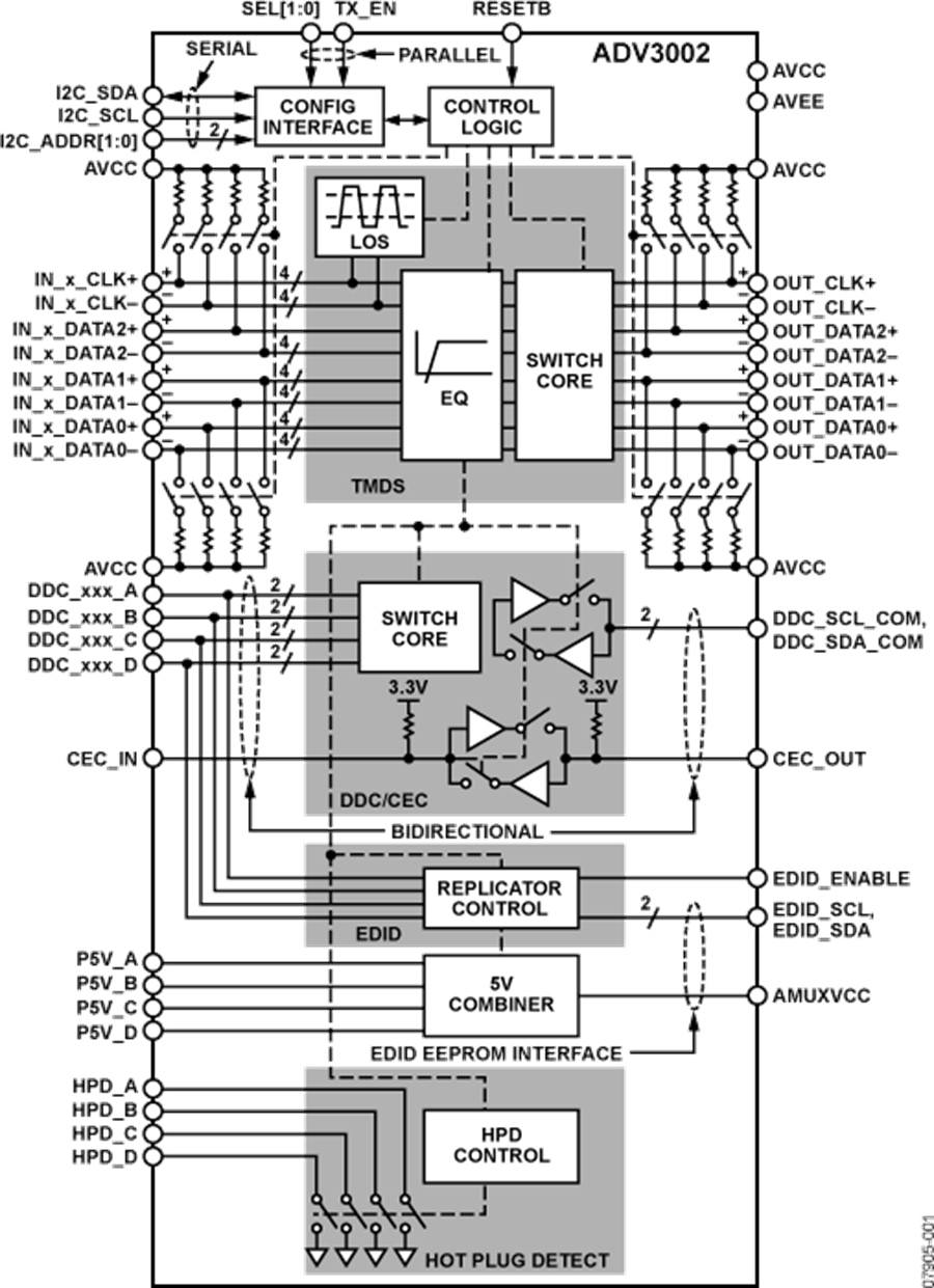 ADV3002是一款完整的HDMI™/DVI链路开关,具有均衡TMDS(最小化传输差分信号)输入,非常适合配置长电缆的系统。该器件具有针对DDC总线和CEC线路的双向缓冲功能,同时集成用于CEC线路的上拉电阻。此外,它还具有EDID复制功能,使得所有四个HDMI端口可以共享一个EDID EEPROM。ADV3002提供80引脚LQFP表贴无铅塑封封装,节省空间;额定工作温度范围为0°C至85°C。