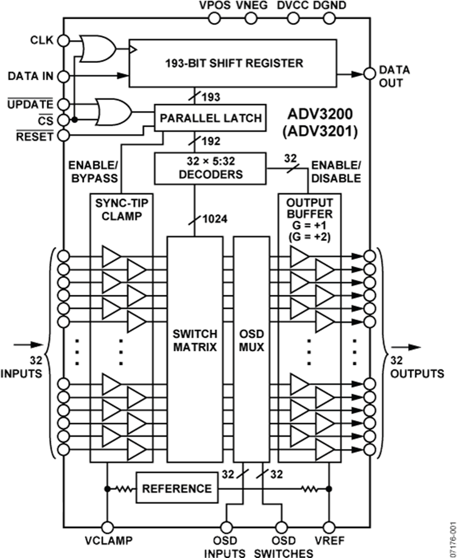 ADV3200/ADV3201为32 × 32模拟交叉点开关矩阵,具有适合交流耦合应用的可选同步脉冲顶部箝位输入,以及屏幕显示(OSD)插入多路复用器。两款器件的串扰性能均为-48 dB,隔离性能为-80 dB (5 MHz),因而适合许多高密度路由应用。同时0.1 dB平坦度达60 MHz,堪称复合视频切换应用的理想之选。ADV3200/ADV3201内置32个独立输出缓冲器,可以将这些缓冲器置于高阻抗状态,以提供并行交叉点输出,因此构建更大阵列时,关断通道仅向输出总线提供极小的负载。ADV3200提供增益+1,ADV3201提供增益+2,适合后部端接负载应用。两款器件可以采用5 V单电源、±2.5 V双电源或±3.3 V双电源(G = +2)供电,所有输出均使能时的空闲功耗仅为250 mA。通道开关通过双缓冲式串行数字控制接口实现,可以利用该接口将多个器件以菊花链形式连接起来。