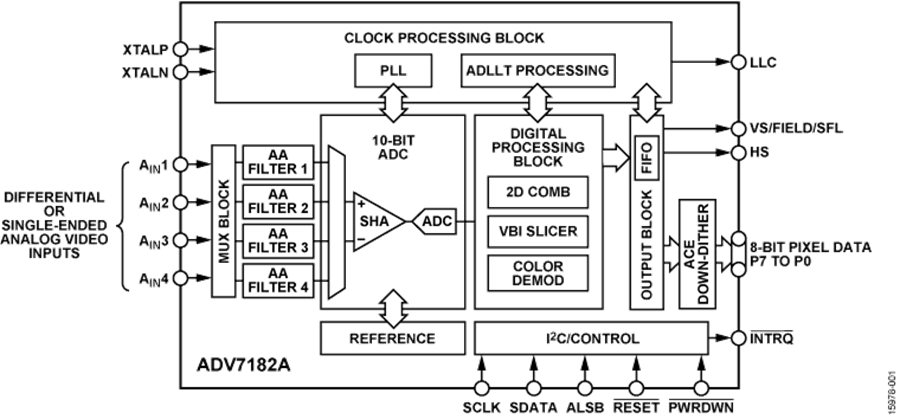 The analog input of the ADV7182A features a single, 10-bit analog-to-digital converter (ADC) and an on-chip differential to single-ended converter to accommodate direct connection of differential, pseudo differential, or single-ended CVBS withoutthe need for external amplifier circuitry.