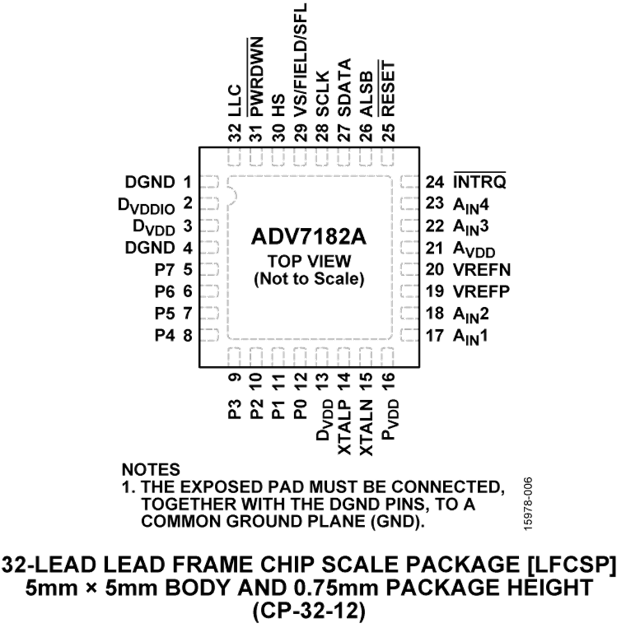 The ADV7182A is provided in a space-saving, LFCSP, surface-mount, RoHS compliant package. It is offered in an automotive grade rated over the −40°C to +105°C temperature range, aswell as a −40°C to +85°C industrial temperature range, making the device ideal for automotive, industrial, and consumer applications.