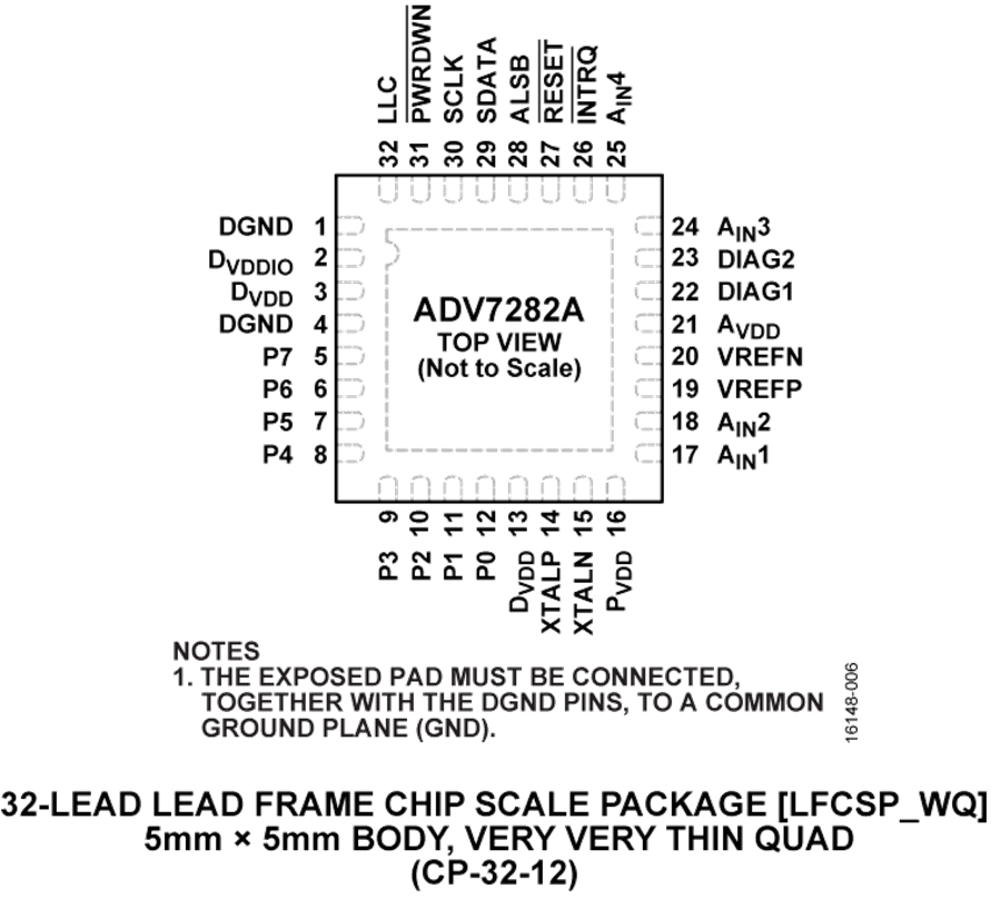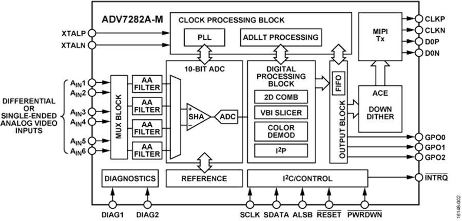 The ADV7282A has the same pinout as and is software compatible with the ADV7282. The mobile industry processor interface (MIPI®) model of the ADV7282A (ADV7282A-M) has the same pinout as and is software compatible with the ADV7282-M.