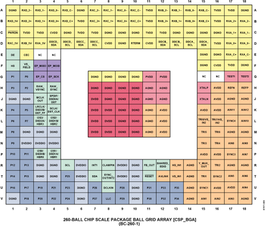 ADV7604 采用先进的CMOS工艺制造,提供260引脚、15 mm ×15 mm BGA表贴封装,节省空间,并且符合RoHS标准;额定温度范围为−40°C至+70°C。