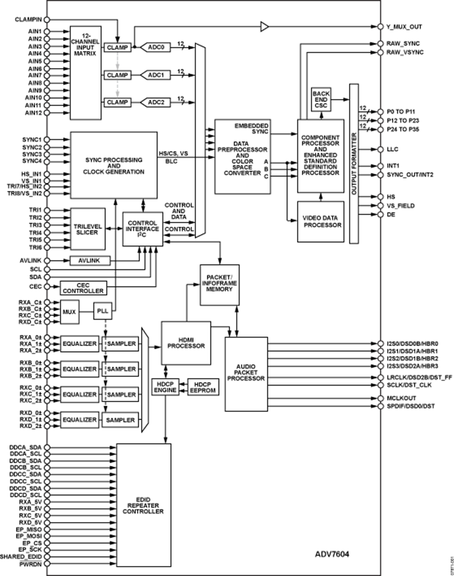 ADV7604 是一款高质量、单芯片、多格式视频解码器及图形数字化仪,并集成有4:1多路复用高清多媒体接口(HDMI™)接收器。该器件含有一个主分量处理器(CP),可处理YPrPb和RGB分量格式,包括RGB图形。CP还处理来自HDMI接收器的视频信号。ADV7604支持四路HDMI和模拟输入模式,因而同时具有HDMI和模拟视频同步处理能力,允许HDMI与ADC之间进行快速切换。