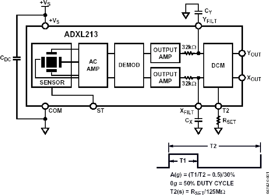 ADXL213是一款完整的低成本、低功耗、双轴加速度计 , 提供经过信号调理、占空比调制的输出 , 所有功能均集成于一个单芯片IC中 。 该器件的满量程加速度测量范围为 ±1.2 g ((典型值) , 既可以测量动态加速度(例如振动) , 也可以测量静态加速度(例如重力)。