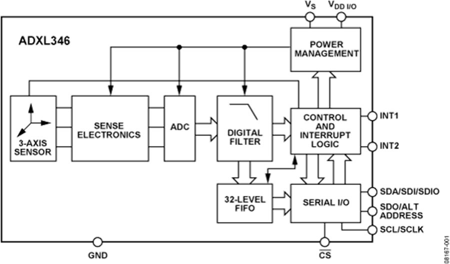 ADXL346非常适合移动设备应用。它可以在倾斜检测应用中测量静态重力加速度,还可以测量运动或冲击导致的动态加速度。它具有高分辨率(4 mg/LSB),能够分辨不到1.0°的倾斜度变化。