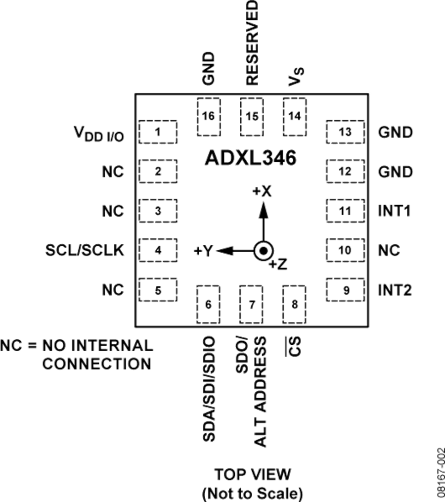 ADXL346采用3 mm × 3 mm × 0.95 mm、16引脚小型超薄塑封封装。