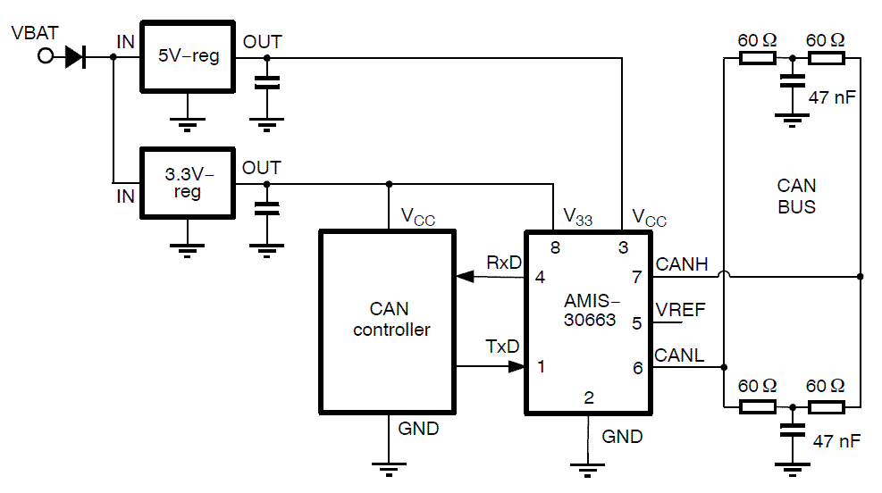 The AMIS-30663 CAN transceiver is the interface between a controller area network (CAN) protocol controller and the physical bus and may be used in both 12 V and 24 V systems. The digital interface level is powered from a 3.3 V supply providing true I/O voltage levels for 3.3 V CAN controllers.