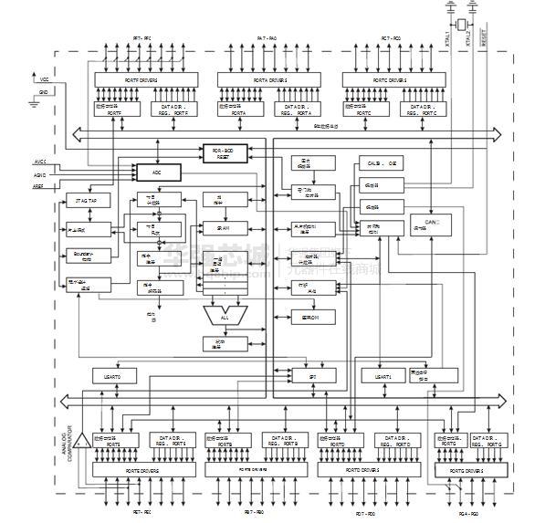 53 gen-ERAL通用I / O口线, 32个通用工作寄存器, CAN控制器,实时计数器( RTC ),四个灵活的定时器/计数器具有比较模式和PWM ,