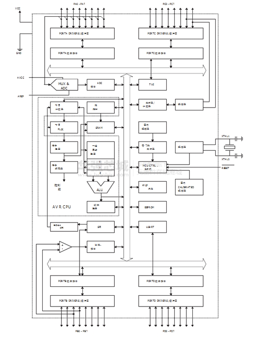 - 六个睡眠模式:空闲模式, ADC噪声抑制,省电,掉电,待机