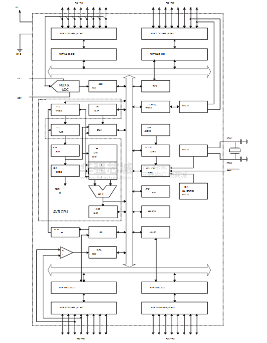 - 六个睡眠模式:空闲模式, ADC噪声抑制,省电,掉电,待机和扩展Standby