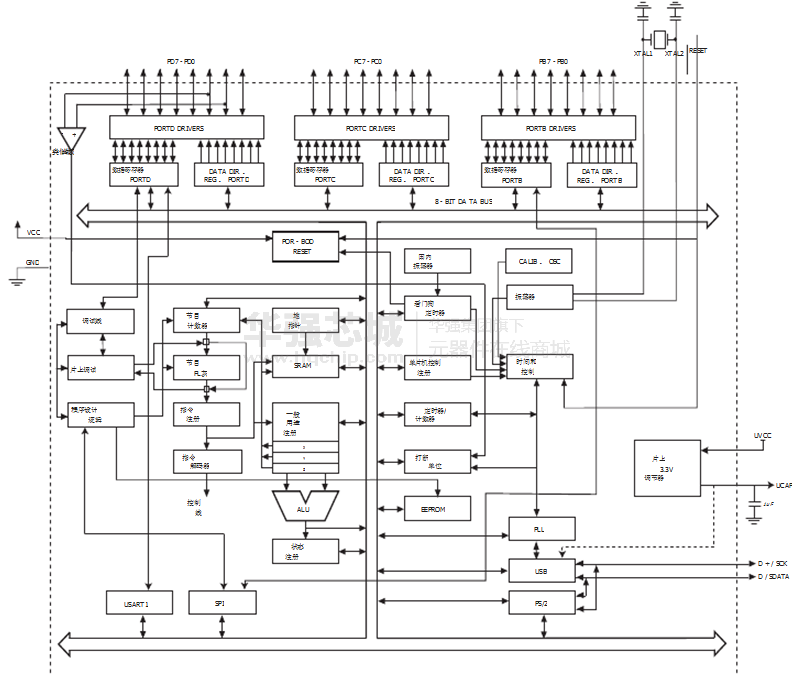 8位微控制器具有ISP功能的Flash和USB控制器8/16 / 32K字节。