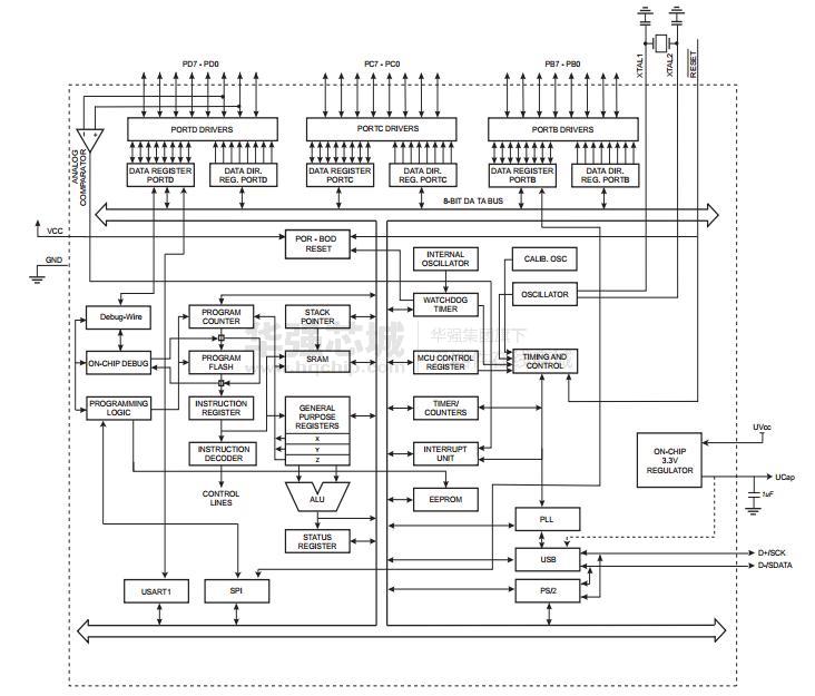 该ATmega8U2 / 16U2 / 32U2是一款基于AVR的低功耗8位CMOS微控制器增强的RISC架构。通过在单个时钟周期内执行强大的指令, ATmega8U2 / 16U2 / 32U2的数据吞吐率每MHz 1 MIPS使系统设计师能够优化功耗和处理速度之间。