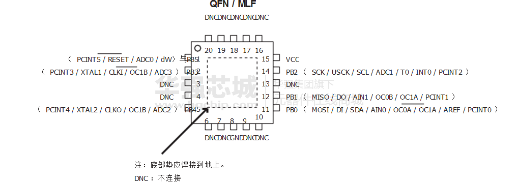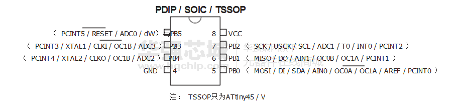 - 采用8引脚PDIP , 8引脚SOIC , 20 - QFN垫/ MLF和8引脚TSSOP (仅ATtiny45 / V)