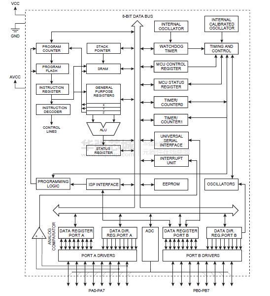 本芯片是以Atmel 高密度非易失性存储器技术生产的。 通过将8 位RISC CPU 与系统内