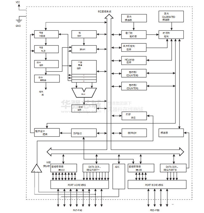 AVR内核具有丰富的指令集和32个通用工作寄存器。所有32寄存器直接连接到算术逻辑单元(ALU) ,允许两个独立的寄存器中在一个时钟周期中执行一个指令来访问。由此产生的架构提高了代码效率,同时实现最高至10倍,比CON-快常规CISC微控制器。
