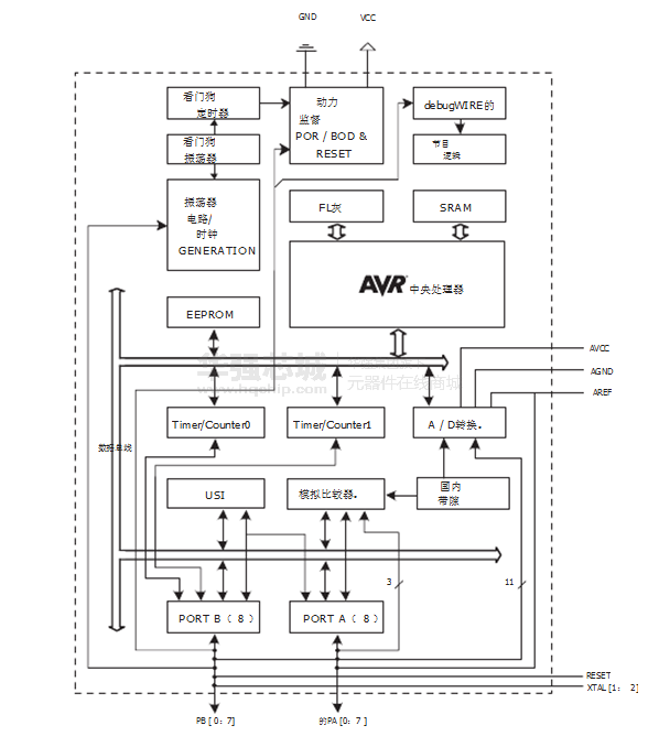 ATtiny261A / 461A / 861A的低功耗CMOS基于AVR 8位微控制器增强的RISC架构。通过在一个单一的时钟周期执行功能强大的指令,所述设备实现数据吞吐率高达1 MIPS每MHz允许系统设计人员为了优化程度降低功耗和处理速度之间。