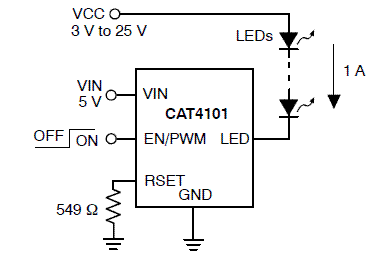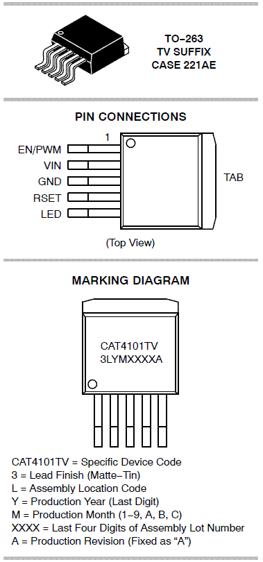 The CAT4101 is a constant-current sink driving a string of high-brightness LEDs up to 1 A with very low dropout of 0.5 V at full load. It requires no inductor, provides a low noise operation and minimizes the number of components. The LED current is set by an external resistor connected to the RSET pin. The LED pin is compatible with high voltage up to 25 V, allowing the driving of long strings of LEDs. The device ensures an accurate and regulated current in the LEDs independent of supply and LED forward voltage variation. The PWM/EN input allows the device shutdown and the LED brightness adjustment by using an external pulse width modulation (PWM) signal. The driver features a thermal shutdown protection that becomes active whenever the die temperature exceeds 150C. The device is available in a high-power, 5-lead TO-263 package offering excellent thermal dissipation characteristics.