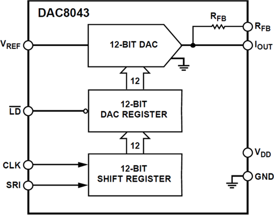 DAC8043是一款高精度12位CMOS乘法DAC,采用节省空间的8引脚PDIP封装。 DAC8043具有串行数据输入、双缓冲和出色的模拟性能,是注重电路板空间应用的理想选择。 另外,线性度和增益误差性能的改善导致不再需要调整器件,因而器件数量得以减少。 输入时钟和负载DAC采用分离式控制线路设计,使用户可以完全控制数据负载和模拟输出。电路由一个12位串行输入、并行输出移位寄存器、一个12位DAC寄存器、一个12位CMOS DAC和控制逻辑构成。 串行数据在CLK脉冲的上升沿进入输入寄存器。 当新的数据字被输入时,会通过LD 输入引脚载入DAC寄存器。 DAC寄存器中的数据由数模转换器(DAC)转换成输出电流。
