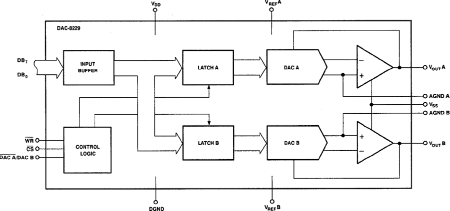 DAC-8229设计用于双电源供电;但将VSS、AGND A和AGND B接至地引脚后,也支持单电源。此时,其工作特性类似于DAC-8228(其引脚排列使其可以支持AD/PM-7528和AD/PM-7628插口)。