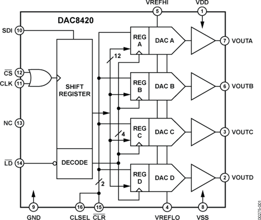DAC8420提供16引脚PDIP、SOIC和CERDIP封装,额定电源范围为+5 V至±15 V,基准电压范围为+2.5 V至±10 V。采用±15 V电源供电时,功耗低于255 mW(最大值);采用+5 V电源供电时,功耗仅为35 mW(最大值)。