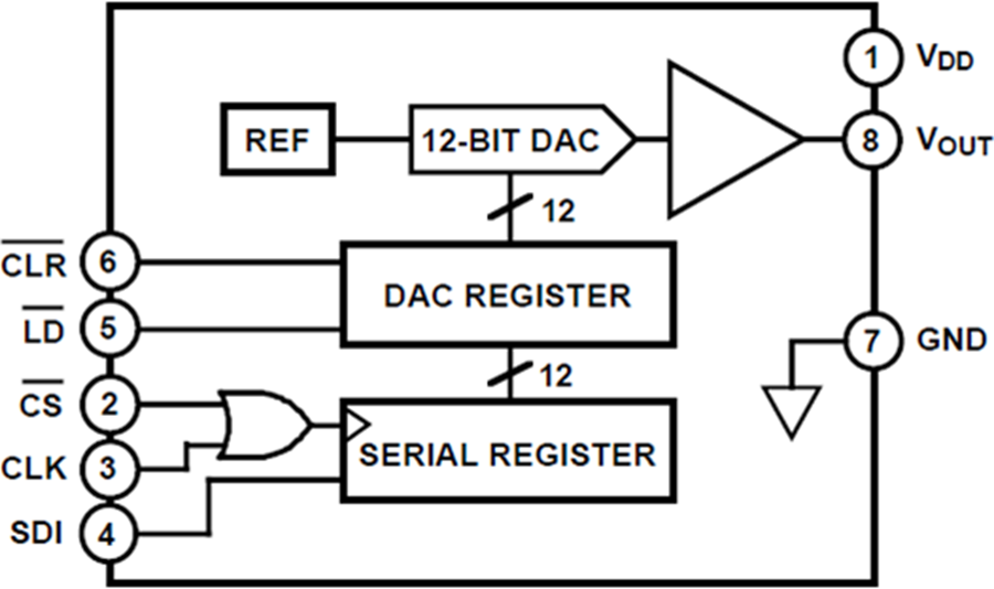 高速、三线式串行接口与DSP兼容,提供数据输入(SDI)、时钟(CLK)和负载选通(LD)三个引脚。还有一个芯片选择引脚,用于连接多个DAC。