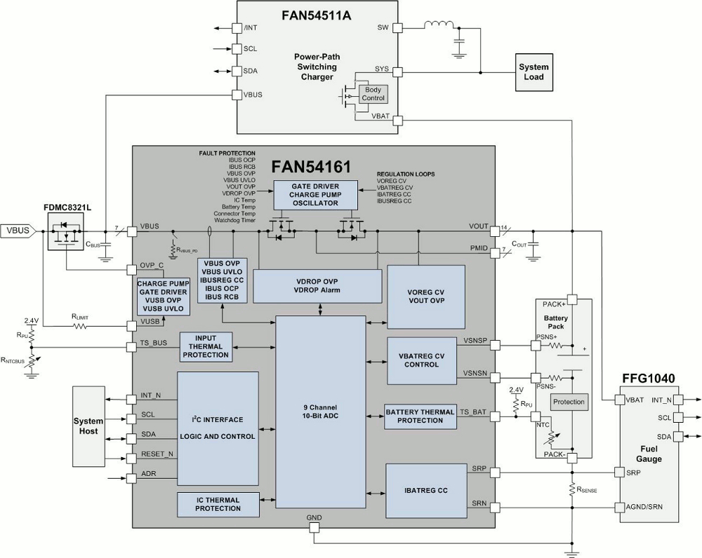 The FAN54161UCX is a low loss direct charger which charges the battery safely at 6 A and provides active protection, regulation and monitoring features.Integrated Protection and Regulation features control a pair of MOSFETs to ensure that the FAN54161UCX output voltage and current stay within a safe programmed operating range. Configurable hardware based safety features turn off the MOSFET in the event of a fault and notify the system.An integrated 10−bit Analog−to−Digital Converter (ADC) provides real−time monitoring of input, output voltage, currents and temperature so that the system host or microcontroller can effectively use this information to optimize adapter and charger configuration.
