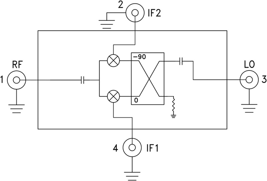低频正交混合器件用于产生100 MHz上边带(USB)IF输出。 这个基于MMIC的模块可以替代混合型I/Q混频器和单边带变频器组件,而且更加可靠。 该模块带有可移除的SMA连接器,这些连接器可以拆卸,以便将模块I/O引脚直接连接到微带或共面电路。