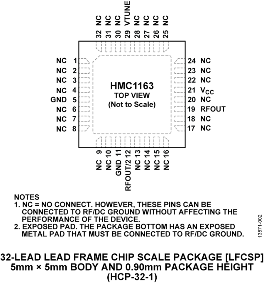采用5 V电源电压时,输出功率为11 dBm(典型值)。VCO采用符合RoHS标准的LFCSP封装,无需外部匹配元件。