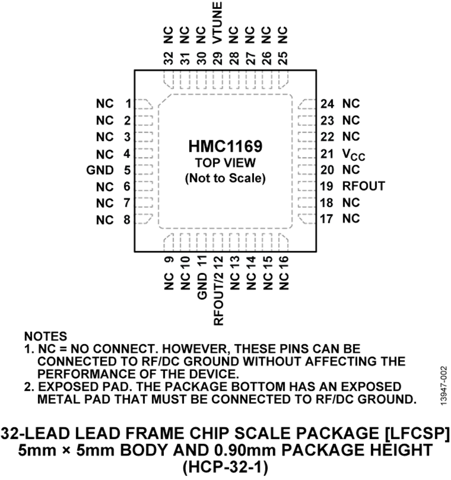 采用5 V电源电压时,输出功率为11.5 dBm(典型值)。 VCO采用符合RoHS标准的LFCSP封装,无需外部匹配元件。