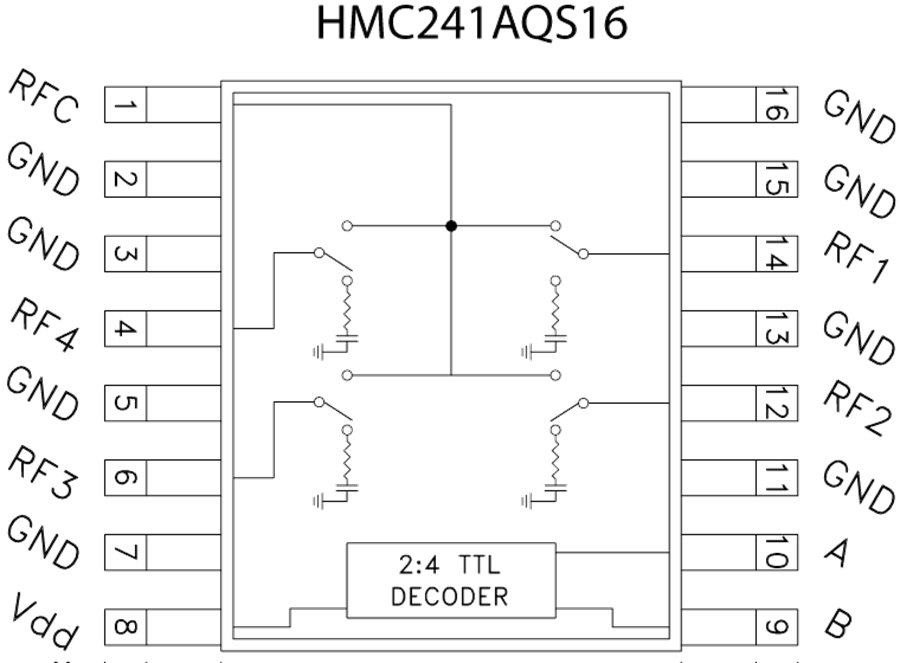 HMC241AQS16和HMC241AQS16E均为通用型低成本非反射式SP4T开关,采用16引脚QSOP封装。 该开关频率范围为DC - 3.5 GHz,在2 GHz时具有高隔离度和0.7 dB的低插入损耗。 该开关提供单正偏置和真TTL/CMOS兼容性。 该开关上集成了2:4解码器,仅需两个控制线和一个正偏置即可选择每个路径,从而可取代GaAs SP4T开关通常所需的8个控制线。