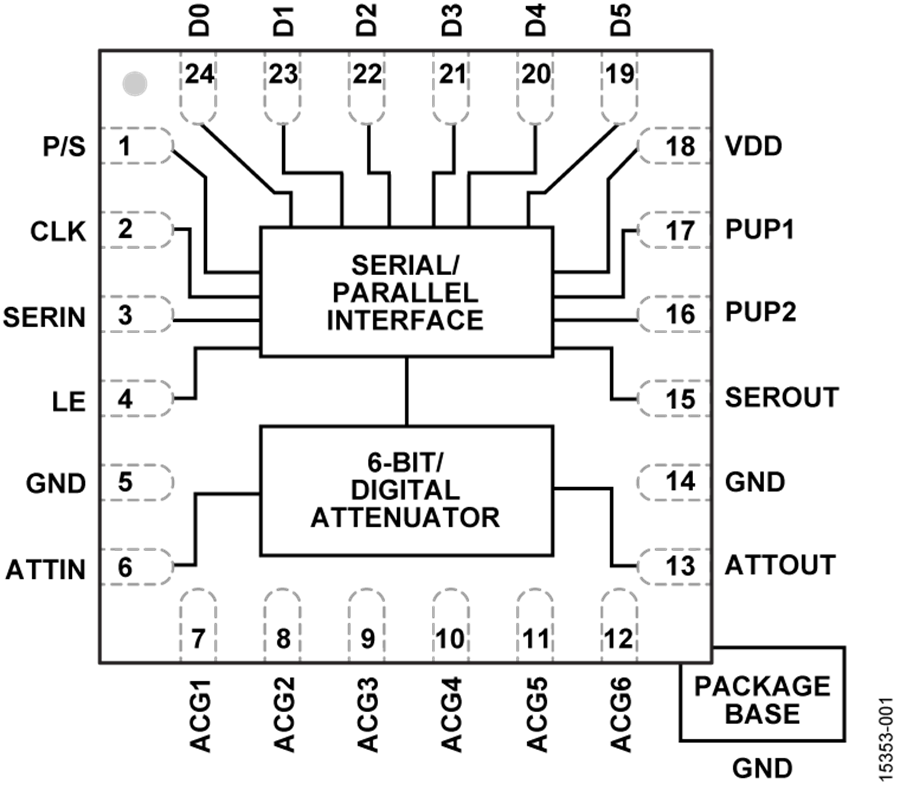 HMC624A集成两个裸片:CMOS驱动器和砷化镓(GaAs) RF衰减器。CMOS驱动器支持对RF衰减器进行串行和并行控制。该器件还提供用户可选上电状态和串行输出端口,可级联其他串行控制元件。