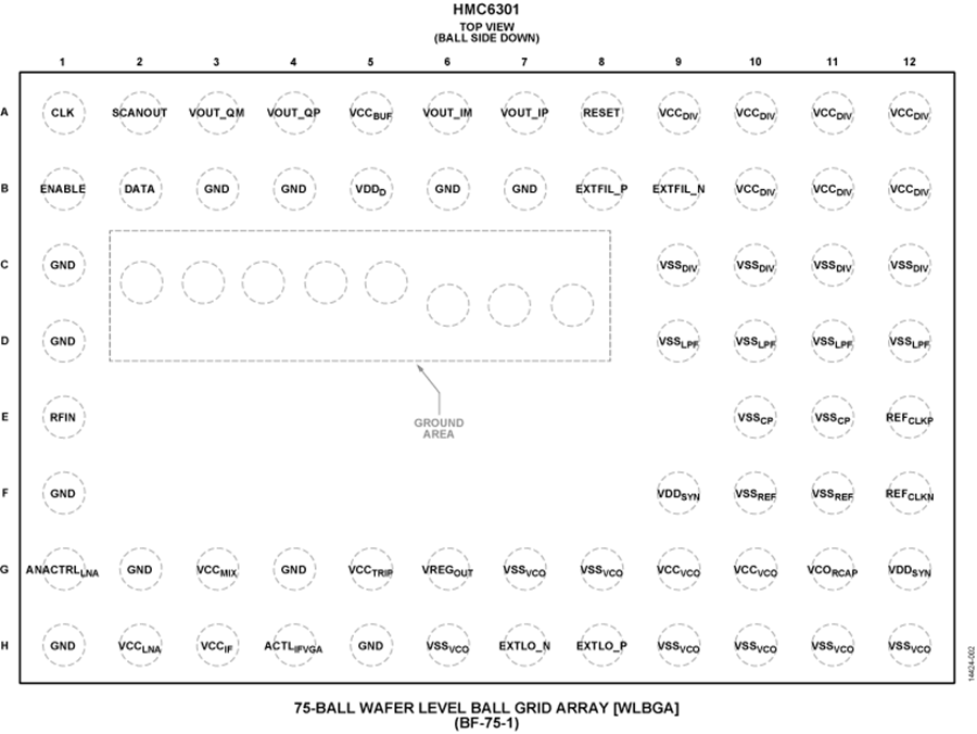 HMC6301是一款完整的毫米波接收器集成电路,采用符合RoHS标准的6 mm × 4 mm晶圆级球栅阵列(WLBGA)封装,包括低噪声放大器(LNA)、镜像抑制滤波器、RF至IF下变频器、IF滤波器、I/Q下变频器和频率合成器。该接收器的工作频率范围为57 GHz至64 GHz,双边调制带宽高达1.8 GHz。