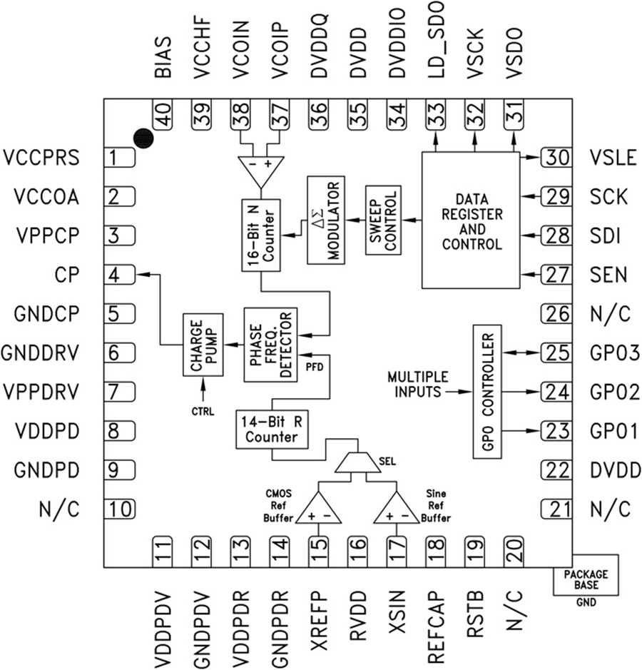 通用输出(GPO)总线支持使用多个VCO。 此外,该频率合成器具有多个辅助时钟生成模式,可通过GPO访问。