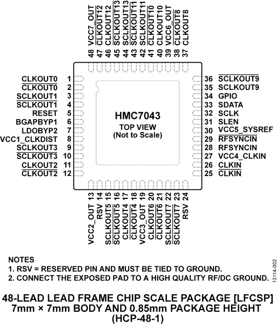 HMC7043采用48引脚、7 mm × 7 mm LFCSP封装,且裸露焊盘接地。