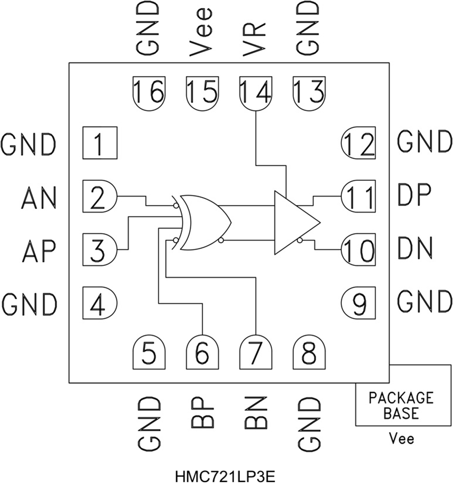 HMC721LP3E的所有输入信号都通过50 Ω电阻片上端接到地,并支持直流或交流耦合。 HMC721LP3E的差分输出可以为直流或交流耦合。 输出可以直接连接到50 Ω接地端接系统,如果采用50 Ω端接至非接地直流电压,则可以使用隔直电容。 HMC721LP3E采用-3.3V DC单电源供电,采用符合RoHS标准的3x3 mm SMT封装。