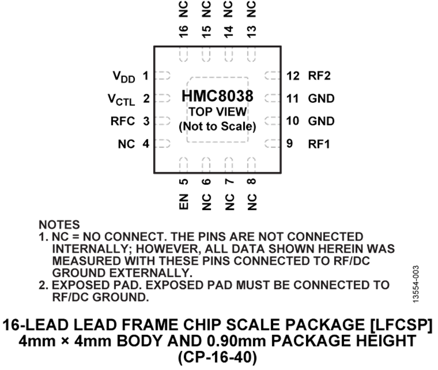 HMC8038的所有器件引脚均提供ESD保护,包括RF接口,并可承受4 kV HMB和1.25 kV CDM。 HMC8038分别提供150 ns和170 ns的快速开关和RF建立时间性能。 该器件采用符合RoHS标准的紧凑型4 mm × 4 mm LFCSP封装。