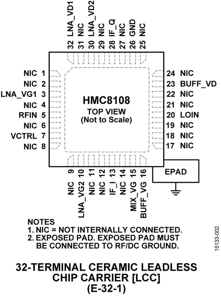 HMC8108是一款紧凑型、X频段、砷化镓(GaAs)单芯片微波集成电路(MMIC)同相正交(I/Q)低噪声转换器,采用符合RoHS标准的陶瓷无铅芯片载体封装。HMC8108将范围为9 GHz至10 GHz的射频(RF)输入信号转换为输出端的60 MHz典型单端中频(IF)信号。该器件提供13 dB的小信号转换增益、2 dB的噪声系数和20 dBc的镜像抑制性能。