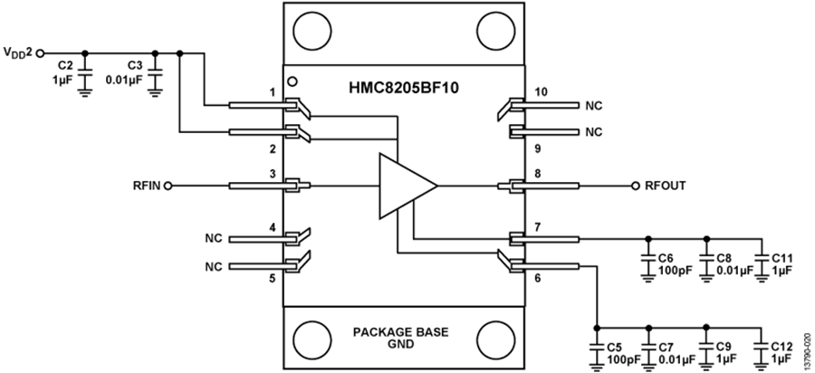 HMC8205BF10放大器采用10引脚陶瓷芯片载体(LDCC)封装。