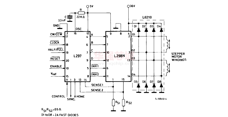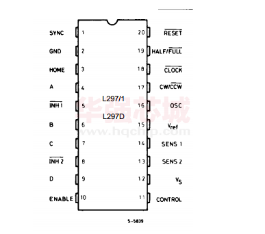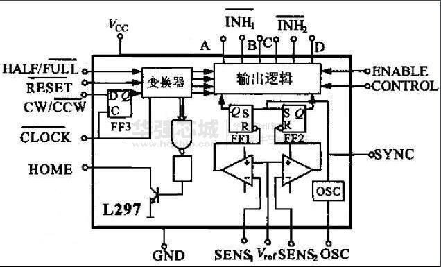 L297是步进电机专用控制器,它能产生4相控制信号, 可用于计算机控制的两相双极和四相单相步进电机,能够用单四拍、双四拍、四相八拍方式 控制步进电机。芯片内的PWM 斩波器电路可开关模式下调节步进电机绕组中的电机绕组中 的电流。该集成电路采用了SGS 公司的模拟/数字兼容的I2L 技术,使用5V 的电源电压, 全部信号的连接都与TFL/CMOS 或集电极开路的晶体管兼容。