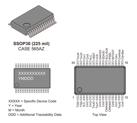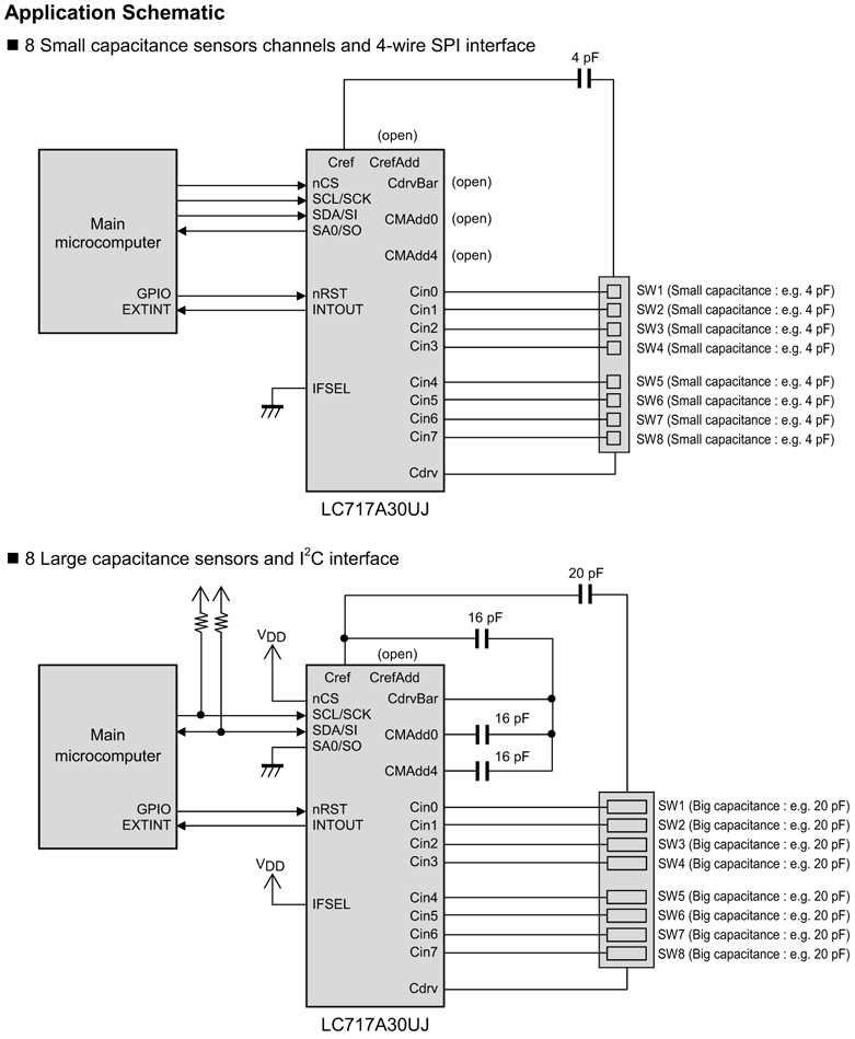 The LC717A30UJ is a high performance, low cost, and highly usable capacitance converter for electrostatic capacitive touch and proximity sensors. 8 capacitance-sensing input channels ideal for use in any end products that needs an array of switches. The LC717A30J facilitates a short system development time through its automatic calibration function and minimal external components. The detection result (ON/OFF) for each sensor is read out by the serial interface (I