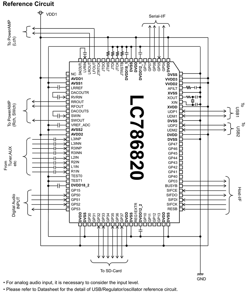 The LC786820E integrates ARM7TDMI-S™, USB host processing, SD memory card host processing, compressed audio decode processing, audio signal processing and a flash memory which stores the program for ARM7TDMI-S™ and the various data. The sophisticated programs in the flash memory for the USB host processing for the SD memory card processing or audio signal processing etc. make the process of external main microcontroller easier and very helpful to develop a much features/high performance audio player system.