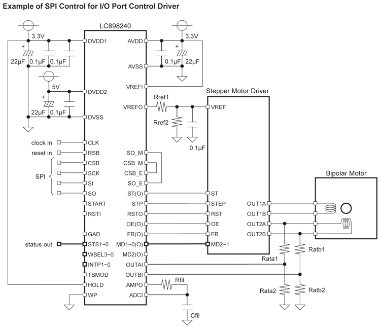 The LC898240 consists of the monitor inputs from motor terminal, serial port inter face, the step control signal inputs from a microprocessor and the outputs to a stepper motor driver. The topology of a microprocessor, a stepper motor driver and LC898240, can be arranged to match various drivers and system architecture. Thus, it can be used as an interface converter between a microprocessor and a driver with the advanced control functions.