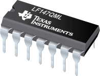 描述 The LF147 is a low cost, high speed quad JFET input operational amplifier with an internally trimmed input offset voltage (BI-FET II technology). The device requires a low supply current and yet maintains a large gain bandwidth product and a fast slew rate. In addition, well matched high voltage JFET input devices provide very low input bias and offset currents. The LF147 is pin compatible with the standard LM148. This feature allows designers to immediately upgrade the overall performance of existing LF148 and LM124 designs.The LF147 may be used in applications such as high speed integrators, fast D/A converters, sample-and-hold circuits and many other circuits requiring low input offset voltage, low input bias current, high input impedance, high slew rate and wide bandwidth. The device has low noise and offset voltage drift.特性Internally Trimmed Offset Voltage: 5 mV Max Low Input Bias Current: 50 pA Typ. Low Input Noise Current: 0.01 pA/√Hz Typ. Wide Gain Bandwidth: 4 MHz Typ. High Slew Rate: 13 V/μs Typ. Low Supply Current: 7.2 mA Typ. High Input Impedance: 1012Ω Typ. Low Total Harmonic Distortion: AV= 10, RL = 10KΩ, VO = 20VP-P BW = 20Hz – 20KHz ≤0.02% Typ.Low 1/f Noise Corner: 50 Hz Typ. Fast Settling Time to 0.01%: 2 μs Typ. All trademarks are the property of their respective owners.